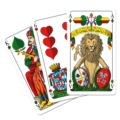 Die historischen Regensburger Spielkarten sind fit für den Kartlertisch der Gegenwart. Unsere Neuzeichnung vereint historische Motive mit den Ansprüchen heutiger Spieler. Beschriftungen mit Kartenwert und Farbzeichen in allen vier Ecken erlauben es, die ganze Pracht der traditionellen Szenen zu genießen und dennoch nerviges Karten Umdrehen unnötig zu machen - das Beste aus beiden Welten.